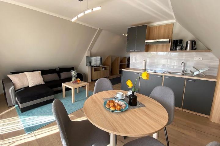 Az apartman nappalijában van egy kinyitható kanapé, ami plusz egy fő számára kényelmes alvóhely.