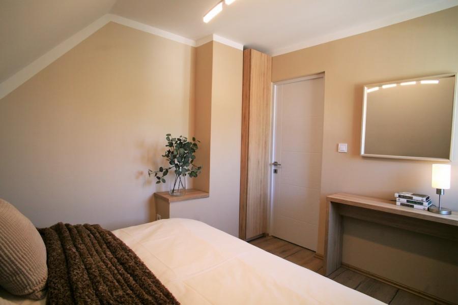 Itt került kialakításra egy meghitt hálószoba, fantasztikus kétszemélyes ággyal, valamint egy világos, tágas fürdőszoba.